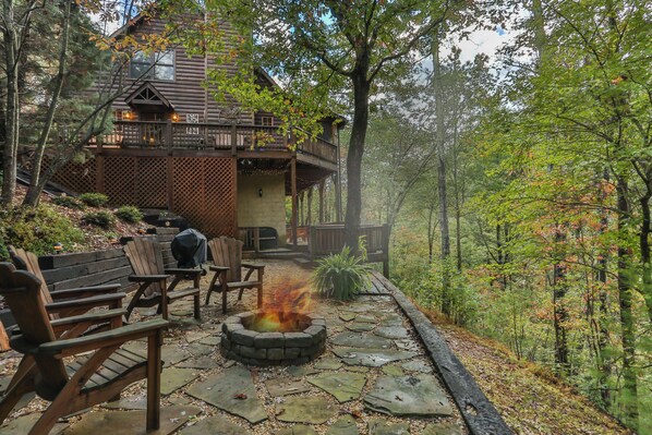 This cabin features two inviting King master suites, one on the main level and one upstairs. Each suite features its own wood-burning fireplace, 50-inch flat-screen TV, private bathroom, and access to a screened-in porch, creating a relaxing private retreat with the creek just below.