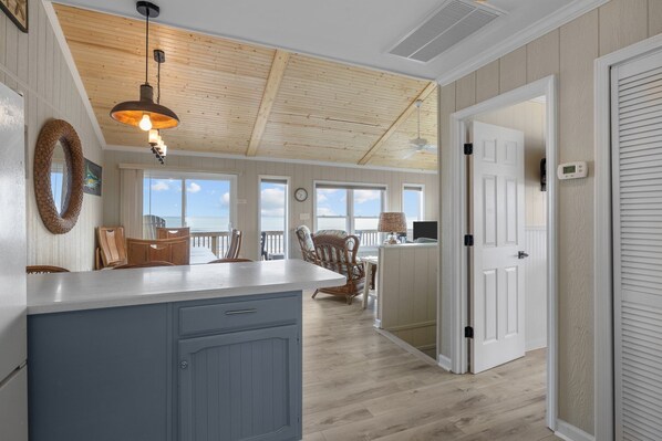 Living Area: Unwind in the living room, where expansive picture windows invite the beauty of the coast inside — perfect for watching vibrant Emerald Isle sunsets. Spend quality time with family and friends with a game or movie night.