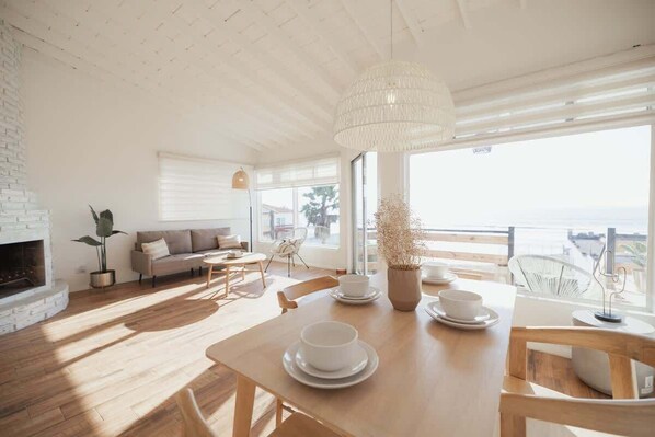 The living room is a cozy and relaxing space for entertaining and enjoying the spectacular ocean views from its large window.