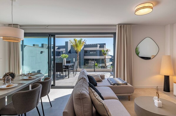 A bright and sophisticated open-plan space featuring elegant furniture and a Smart TV. The large glass doors create a seamless connection to the massive private terrace, bathing the room in natural light.