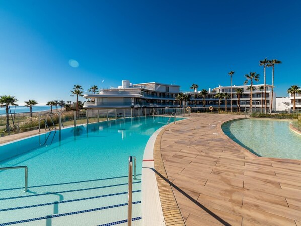 Ved stranden og med innendørsbasseng