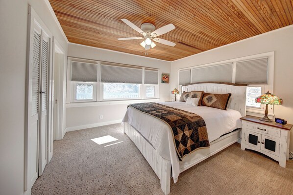 To the right is the primary bedroom with King bed. Adjoining the bedroom is a private ensuite bathroom with a full marble, tile, walk-in shower and single vanity with quartz countertops. Heading towards the back of the house you enter an updated kitchen with SS appliances including: refrigerator, microwave oven, stove and dishwasher. There is a small island is in the middle, perfect for prepping food and seating for two. From the kitchen you enter a laundry room that leads out to a large deck with two seating areas. Enjoy the views of Prospect Mountain while your grill on the BBQ. Connected to the deck is a large fenced-in yard for Fido! Off the kitchen is the dining room with Knotty Pine wainscoting; creating a very cozy, atmosphere- reminding you that you’re in the mountains! From the dining room you enter a large family room with a second fireplace that is floor to ceiling stone. The back of the room is a full wall of windows for ample viewing of the mountains and wildlife. On the other side of the house there are 3 more bedrooms. Two rooms with Queen beds and one with Twin beds. Each room has plenty of closet space for all your vacation, hiking clothes. A full-size bathroom is located in the hallway between the bedrooms. New hexagon penny tile in the bathroom adds to the charm of the antique claw foot tub with curtain surround. A new single vanity gives you ample storage for all your bath essentials. The whole house has new carpet and freshly painted. This rental is a smoke free zone!