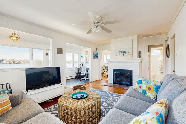 Dette enslige hjemmet ligger på den vestlige kysten av Little Pond, og tilbyr gjestene uhindret soloppgang på innsjøen. Ta lett spaserturer for å svømme og kajakk ved Bristol Beach (en kvart kilometer sør) eller Falmouth Heights Beach (en halv mil sørvest), og tilbringe kveldene servering og jubel på Falmouth Commodores i sentrum av byen en mil vest.