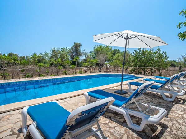 Ses Casetes 6 km fra Felanitx: Gårdshus "Casetes", frittstående, omgitt av jorder. 6 km fra sentrum av Felanitx, 8 km fra sentrum av Campos, 48 km fra sentrum av Palma, 15 km fra sjøen, 17 km fra stranden, i det grønne, beliggenhet mot sør. Fellesbruk: tomt (inngjerdet). Privat: uberørt tomt 15'000 m2, hage med planter og trær, svømmebasseng (8 x 4 m, Sesongåpent: 01.Jan. - 31.Des.). Utendørs dusj, bordtennis, Underholdning av bassenget av eieren/gartneren. Parkering på tomten. Butikk 6 km, daglivarehandel 6 km, supermarked 7 km, kjøpesenter 10 km, restaurant 8 km, bar 7 km, bakeri 8 km, café 7 km, bussholdeplass "Felanitx" 6 km, sandstrand "Cala Mondragó" 15 km, strand ved klipper "Cala Murada" 20 km. Sporthavn 17 km, marina 17 km, golfbane(18 hull) 12 km, surfeskole 15 km, seileskole 15 km, tennis 14 km, rideskole 1 km, turstier fra hbrukt 8 km, sykkelvei 8 km. Attraksjoner i nærheten: Coves dels Hams 23 km, Safari Zoo 28 km, Sant Salvador 17 km. Vennligst merk: bil anbefales.