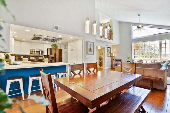 Nyt litt kvalitetstid med gruppen din som koser deg et måltid eller spiller et brettspill ved middagsbordet som har plass til 6, og bordet kan forlenges ved å sette inn bladet for å gi ekstra bordplass!
