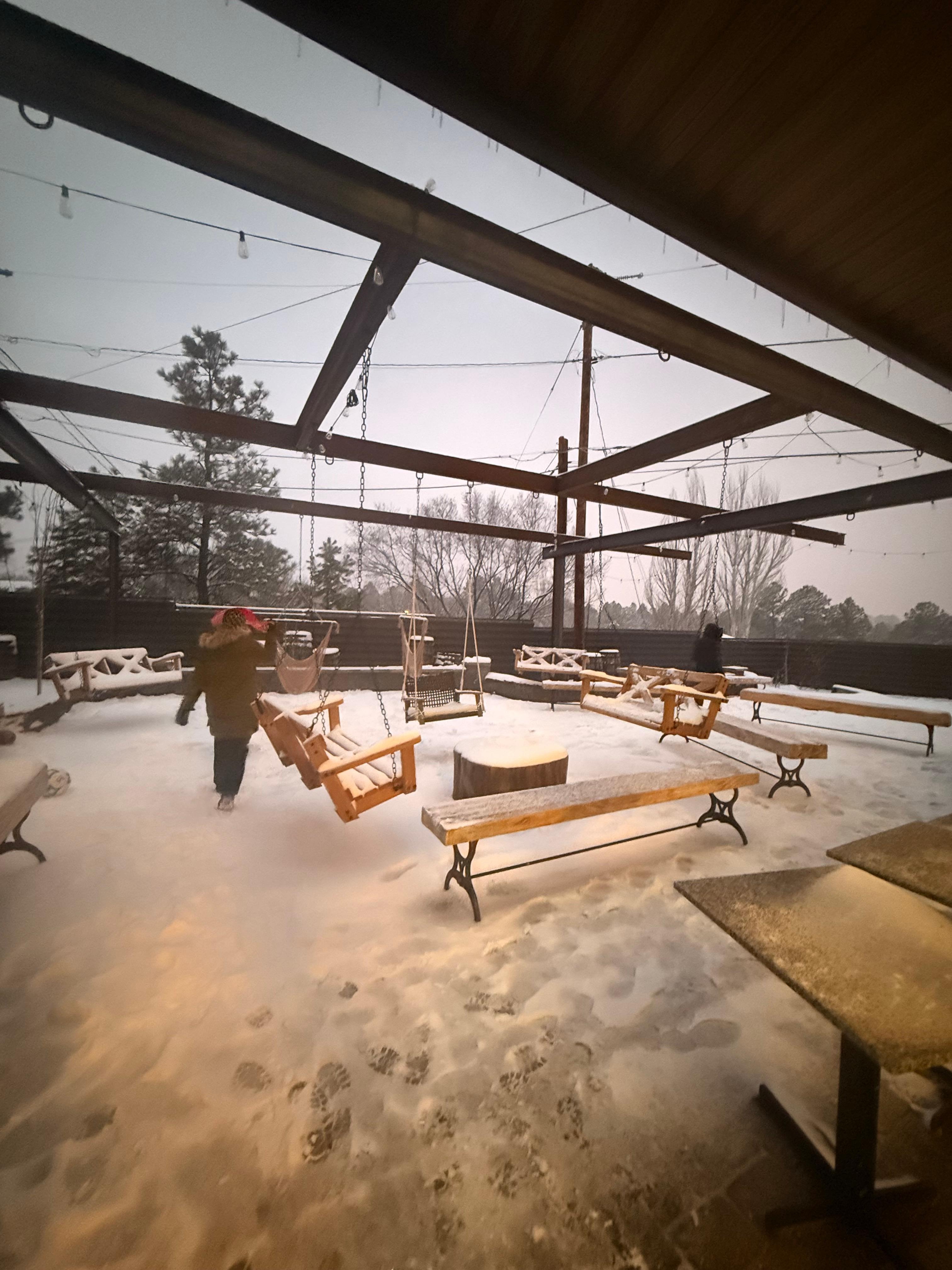 Backyard stargazing pergola and swing set for adults: Huge pushback glass doors connect the atrium to a 10-foot-tall stargazing i-beam pergola for a dramatic and inviting space. Surrounding the glowing firepit, oversized hanging chairs and bench swings offer the perfect setting for teammates and families to unwind, laugh, and share stories. Whether gently swaying under the stars or gathered close to the fire’s warmth, this rustic industrial gathering spot ties it all together with relaxation and fun.