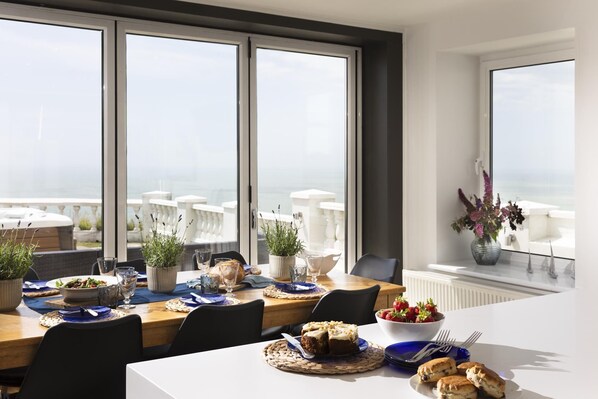 Kitchen with breakfast tables and six seats with bi folding doors to the terrace with views and hot tub. TV with Freeview wall mounted. Fully equipped kitchen with dishwasher, 4 ring hob, electric double oven. Utility room with American fridge/freezer, washing machine.