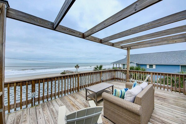 Admire a spectacular view of the Atlantic Ocean from the covered veranda and the incredible rooftop terrace at this home on Folly Beach, where you'll be directly across the road from The Washout - the very best surfing spot in the area.
