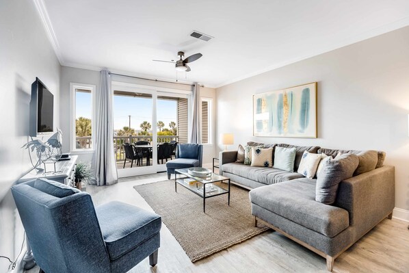 With the sandy beach waiting just across West Arctic Avenue, swimmers and sunbathers won't find a more comfortable, convenient home base in Folly Beach than this three-bedroom, three-bathroom condo with a view of the Atlantic Ocean. Newly renovated and freshly furnished in calming tones of white, blue, and seafoam green, this condo is a peaceful space to return to after days spent soaking in the sunshine. Spend gorgeous afternoons outside on the porch, taking in the view of the water with a glass of cold sweet tea in hand, and prepare home-cooked meals with your loved ones in the fully equipped kitchen with new appliances. When you're not perusing the offerings on Center Street less than a block away, you'll be treated to new sofas and a flatscreen TV in the living room, a dining table with adjacent bar seating for dinners and desserts at home, and three serene bedrooms - each paired with its own private bathroom.