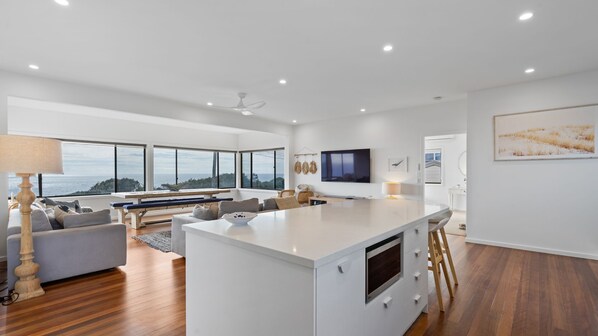 There are four large bedrooms sleeping nine guests with two modern bathrooms. Both front bedrooms have King beds with ocean views, the master bedroom with walk in robe, ensuite with full size bath. The third bedroom has a Queen bed and the fourth bedroom with district views has 2 king single beds, All of the beds are made up with linens, and towels are rolled up ready for the bathrooms, just don't forget to pack your own beach towels.