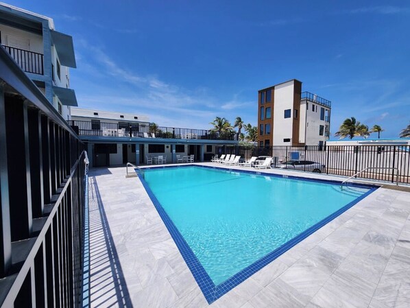 Enjoy Hollywood Beach and the Boardwalk, this delightful ground floor apartment offers a brilliant stay for guests. With views of the beach as you relax on the front patio. With 1 cozy bedroom featuring a king bed with a full bath and a stylish living room with an additional queen bed, this fantastic property is perfect for anyone looking for a gorgeous place to relax. Enjoy your time in Hollywood at our apartment on the beach. Cool off and realx poolside at your private heated pool onsite, just steps from the apartment. Great views of the beach from the 2nd floor sundeck next to the pool. Make yourself at home and create memories of a lifetime.
