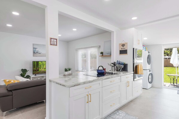 Soak up the abundant sunshine and fresh ocean air on the home’s back patio, dining al fresco at the table or enjoying those first few sips of morning coffee at the café seating for 2 while your furry friends run and play in the grassy yard. Leave the car at home in favor of a breezier transportation option, a pair of bikes whisking you around the neighborhood in style as you set off on the first of many adventures.