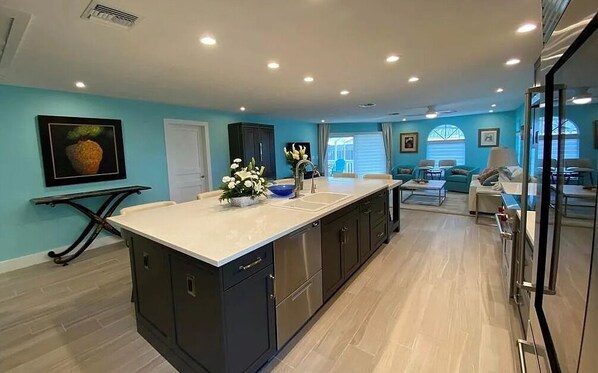 Discover your perfect getaway at Island Escape, a beautiful canal-front home on Fort Myers Beach's South end. This 3-bedroom, 2-bath oasis features lush landscaping, a private pool, and a screened lanai for ultimate relaxation. The fully equipped kitchen is a chef's dream, boasting an extra-large island perfect for meal prep or a fun game night with family and friends. After a day in the sun, unwind in the cozy living room and enjoy your favorite movie on the large flat-screen TV.