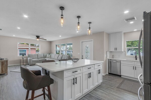 Luxurious Kitchen: Fully equipped with stainless steel appliances, granite countertops, and a large island, perfect for preparing meals and entertaining