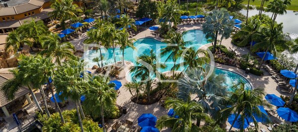 FAQ: Step-free entry, stairs required to access bedrooms, pool depth (1'-5'), golf cart rental on-site (additional