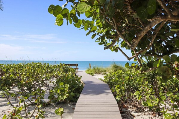 Sol Mate fronter et bredt område av Captiva-stranden, kjent for sin hvite sand, vakre skjell, varme Mexicogolfen og rikelig med solskinn. En kort strandpromenade fører rett inn på sanden - så lett å hoppe frem og tilbake mellom huset og stranden. En full tilgjengelighetsrampe med rekkverk med en avstand på 28 tommer fra hverandre fører ned til en strandsti eller til parkeringsområdet. Dette er perfekt for inngang uten trapp eller bare for å rulle i bagasjen.