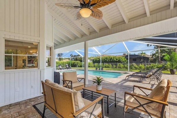 -Extra large pool area with tv, table, seating area and loungers