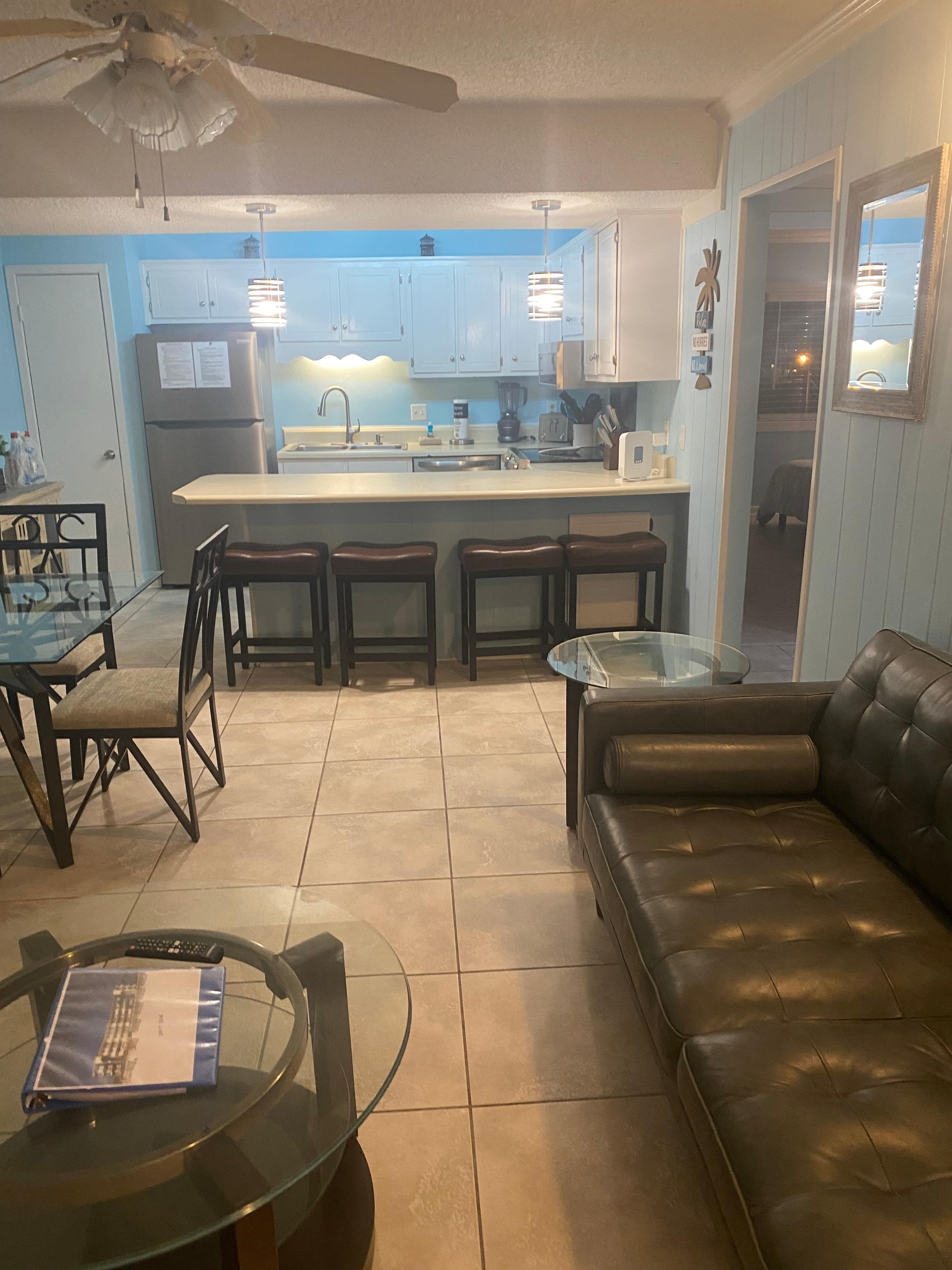 The location is what you’re paying for! The 2 chairs/umbrella and corner beach view is the best part of this. We received check-in instructions at 10:44am CST day of check-in. We drove 8 hours and took almost 2 hours to gain access. Host knew the door keypad was having issues but obviously opted not to correct prior to our arrival. Took us contacting VRBO phone number as only number to call, then conferenced us in with a female host. The host said maintenance would come up which Ty did and he was great. I requested a phone number for actual hist, called and received a male this time. He continued to say, “use the keypad to the right of the door. I asked him if he was the same person I had just spoken to? The code is NOT working on either the keypad nor the key box!” Again, he says the same do I FaceTime him and even with the maintenance man AND at this point property manager,Jacky, who is amazing too, shows up. After a few minutes she goes to see if she has a key and luckily does OR else we would have been stranded with a Walmart delivery order about to arrive! Host sent me check-in instructions after we were en route day of with pdf parking passes which I contacted and he said they were in “the Blue folder inside unit.” They are NOT in the folder. There are also ZERO extra linens/blankets in the unit so bring blankets or sheets. The couch/barstools were different from posted pictures. The exterior lighting is non existent. The side gates are padlocked so only one way in/out