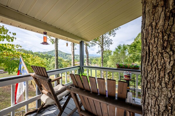 Take in sweeping Smoky Mountain views at this scenic Franklin retreat with rustic charm and modern comforts. Relax on the multi-level deck, enjoy cozy nights by the fireplaces, or have fun in the game room.