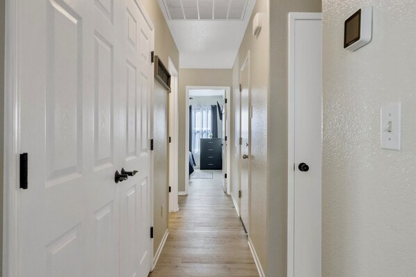 We have a one level, single family home with a garage space and a big, fenced in backyard. We have three bedrooms: one king mattress with an attached bath, two queen mattresses in each guest room and a living room pull out couch. This couch can sleep two people. There is also a queen air mattress.