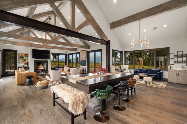 With 5 bedrooms, 5.5 bathrooms, and accommodations for up to 13 guests, Summit Solitude offers a layout designed for both connection and privacy. The main level is where this home truly shines, offering soaring ceilings with exposed beams and an open floor plan that blends the kitchen, dining, and living spaces into one warm and inviting gathering place. The chef’s kitchen is fully stocked with high-end appliances and a spacious island with seating for four, making it as functional as it is beautiful. Just steps away, the large dining table invites you to linger over meals with seating for six in chairs plus bench seating on each end, comfortably fitting 2–4 more guests depending on age. A stylish bar nook with its own mini-fridge and ice maker creates the perfect setup for cocktails or après-ski drinks, while the Sonos surround sound system throughout the main floor sets the mood for every occasion.