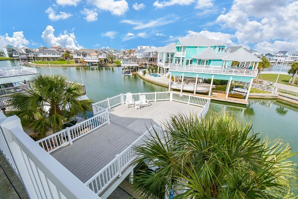 The main deck has a lovely covered seating area that offers serene canal views where you can enjoy your morning coffee or a glass of wine as the sun goes down. The deck extends over the boathouse where the views of the canal are spectacular.