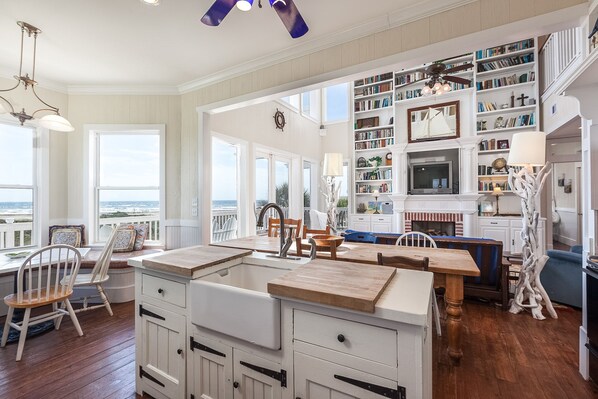 Det store kj��kkenet inkluderer en frokost nook vender mot stranden, slik at du kan nyte utsikt mot stranden mens du spiser. Et stort spisebord bringer familien sammen for m��ltider og gjør et flott sted å samles for familie brettspill.
