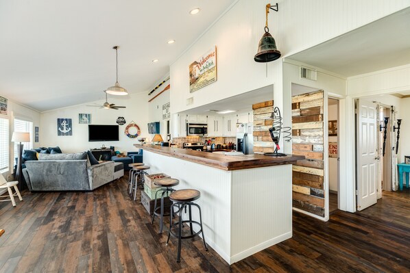 Welcome aboard - funky nautical decor and relaxed furnishings are found throughout, perfect for lounging and catching up with your favorite people. A wall of windows frames the Gulf, visible from the comfy living area, dining table or fully-equipped kitchen. Your group’s chef will love the stainless steel appliances, long breakfast bar, and all the pots, pans, dishes, etc. you’ll need for meals together. Everyone can pitch in to help with budget friendly beach meals. (Don’t forget to grab some fresh seafood from the downtown markets!)