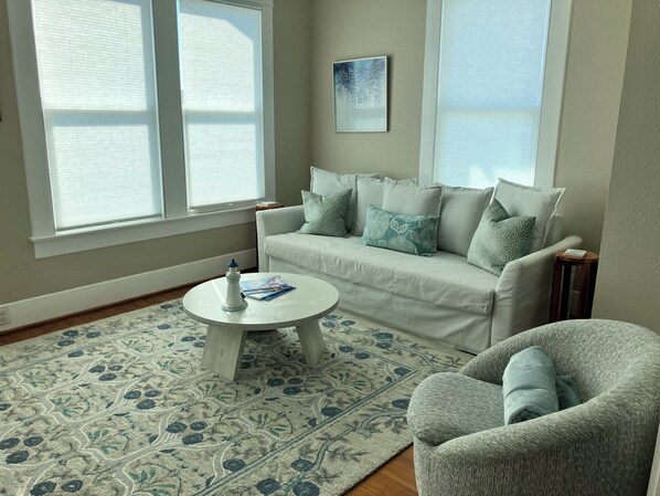 Let your relaxation begin at The Lighthouse! Perfect for a girls' weekend or family getaway, we are within walking distance of the Seawall, beach, restaurants, bike rentals and more! Built in 1924, our lovely home features original hardwood floors and large windows for incredible natural light. Our kitchen is well stocked for cooking, where you'll find new appliances, toaster, blender, hand mixer, coffee maker, and all of the tools you need to enjoy a relaxing meal at home after your island fun. When you finally give in to the day's end, tuck yourself into the gorgeous fourposter queen-sized Rice Bed in the front bedroom, where you'll find a TV hidden in the wardrobe. The second bedroom has two comfortable twin beds with cubbies of games and books for the kids and family. There is even a pack n play for your little one! The bedroom windows have black out shades for late morning snoozing. The living room sofa pulls out to a queen sized bed for extra sleeping space. We have a full-sized washer and dryer for your use. You'll find a patio table and chairs in the fenced back yard to enjoy the sea breezes with your morning cup of coffee or evening cocktails. Enjoy the convenience of a 3-car private driveway bordered by beautiful flowering vines. This home is a top/bottom duplex, with the rental unit upstairs. Owners are not present during your stay, so you'll have privacy in the home and yard. We look forward to sharing our island retreat with you!