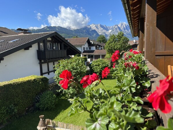 On approx. 65 square metres, two bright and beautiful rooms with space for up to four people await you in the holiday flat, which is located on the 1st floor and was completely renovated in 2022. The modern and cosy furnishings make the flat particularly homely. In the combined living and dining area, you have access to your own south-facing balcony, which conjures up a beautiful Alpine panorama with a view of the Wetterstein Mountains.