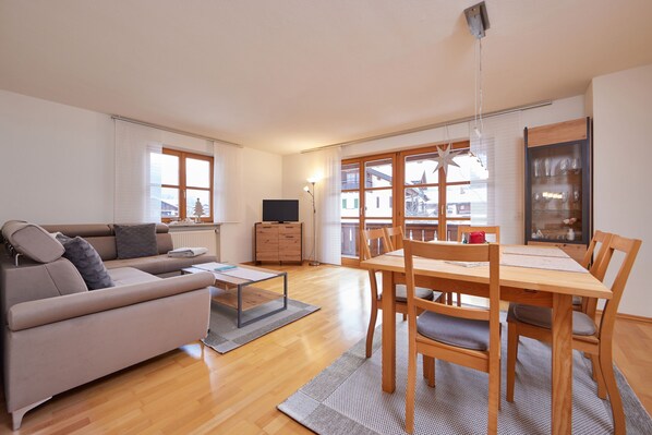 The apartment has a bright and spacious bedroom with a comfortable double bed for restful nights. The spacious living room has a large dining table and an inviting living area with a sofa bed, which is perfect for children. The separate kitchen is equipped with modern appliances and offers you the opportunity to prepare your favourite dishes while enjoying the breathtaking view of the surrounding mountains. There is also an additional small table here, perfect for a cosy breakfast for two.