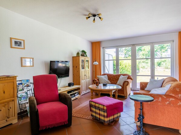 "Losentitz", 4 rom halvpart av tomannsbolig 125 m2 på 3 etasjer. Praktiskt og koseligt møbler: stue/spisestue med, vedovn, spisebord, kabel-TV og radio. Utgang til terrassen. Kjøkken (stekeovn, oppvaskmaskin, 4 keramiske kokeplater, brødrister, vannkoker, mikrobølgeovn, elektrisk kaffemaskin). Sep. WC. øverste etasje: 2 dobbelt rom med skråtak. Utgang til balkongen. Gjennomgangsrom med skråtak med 2 senger. Bad/dusj/WC. øverste etasje: (stige) åpen galleri, Lav dørhøyde 160 cm med, 2 sovemuligheter. Gassoppvarming. Liten balkong 3 m2, terrasse 12 m2, hage, 300 m2. Terrassemøbler, grill, liggestoler. Fasiliteter: vaskemaskin. Internett (trådløs LAN [WLAN]). Parkeringsplass (2 Biler). Vennligst merk: velegnet for familier. Røykfritt hus. Max 2 kjæledyr / hunder tillatt. Røykvarsler, brannslukkningsapparat. Bestillinger er kun tillatt for ferieopphold. I stedet for et innelukket soverom befinner noen soveområder seg i et åpent område (galleri, alkove e.l.).