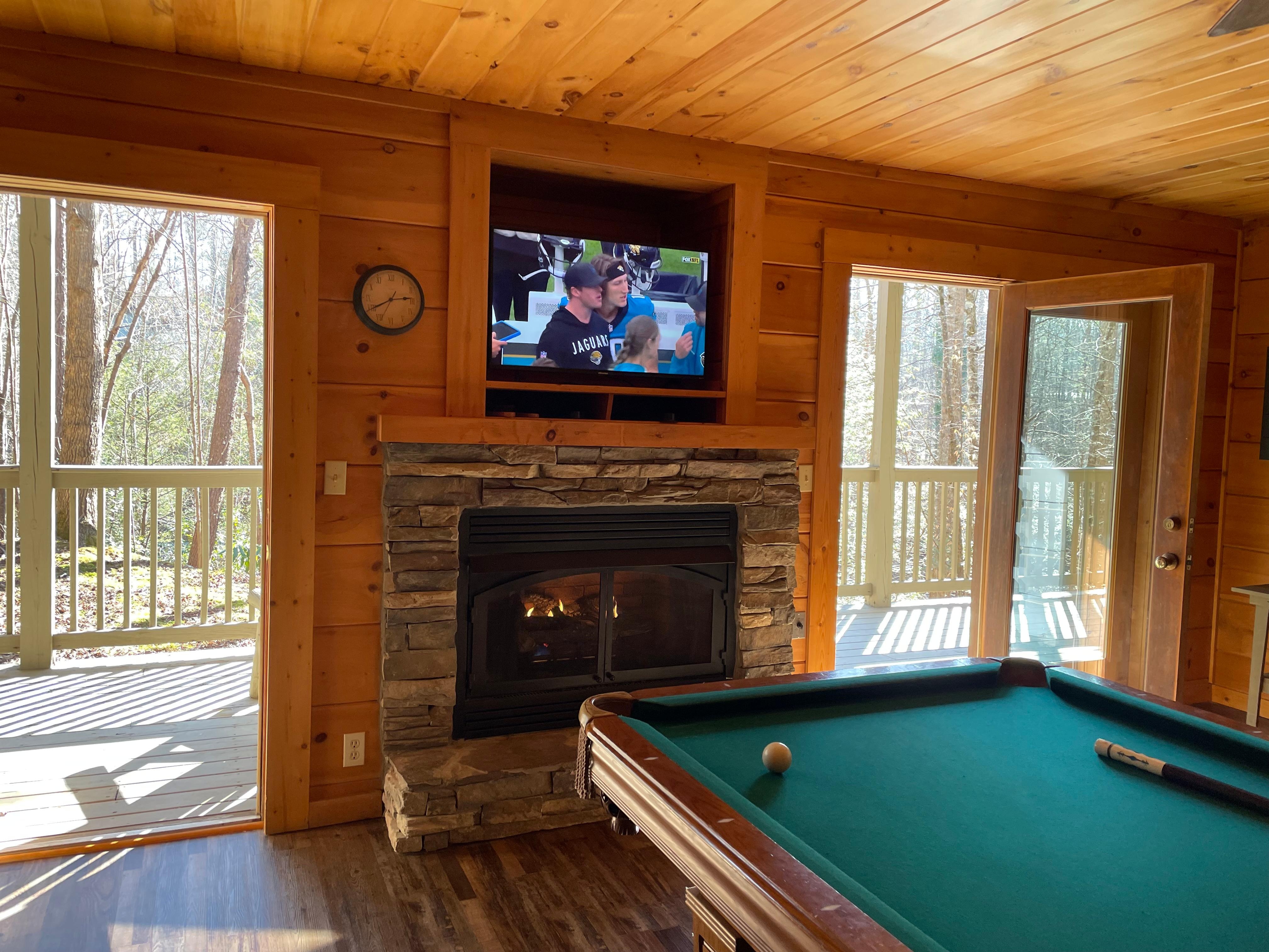 Enjoy the cozy wooded views with a cup of coffee outside on the covered, wraparound decks. On the main level deck, you can relax in the hot tub or in front of the fireplace. The cabin furnishes wireless internet access, Smart televisions in every room, pool table, MULTICADE arcade machine, charcoal grill, 3 gas fireplaces, and central heat and air.
