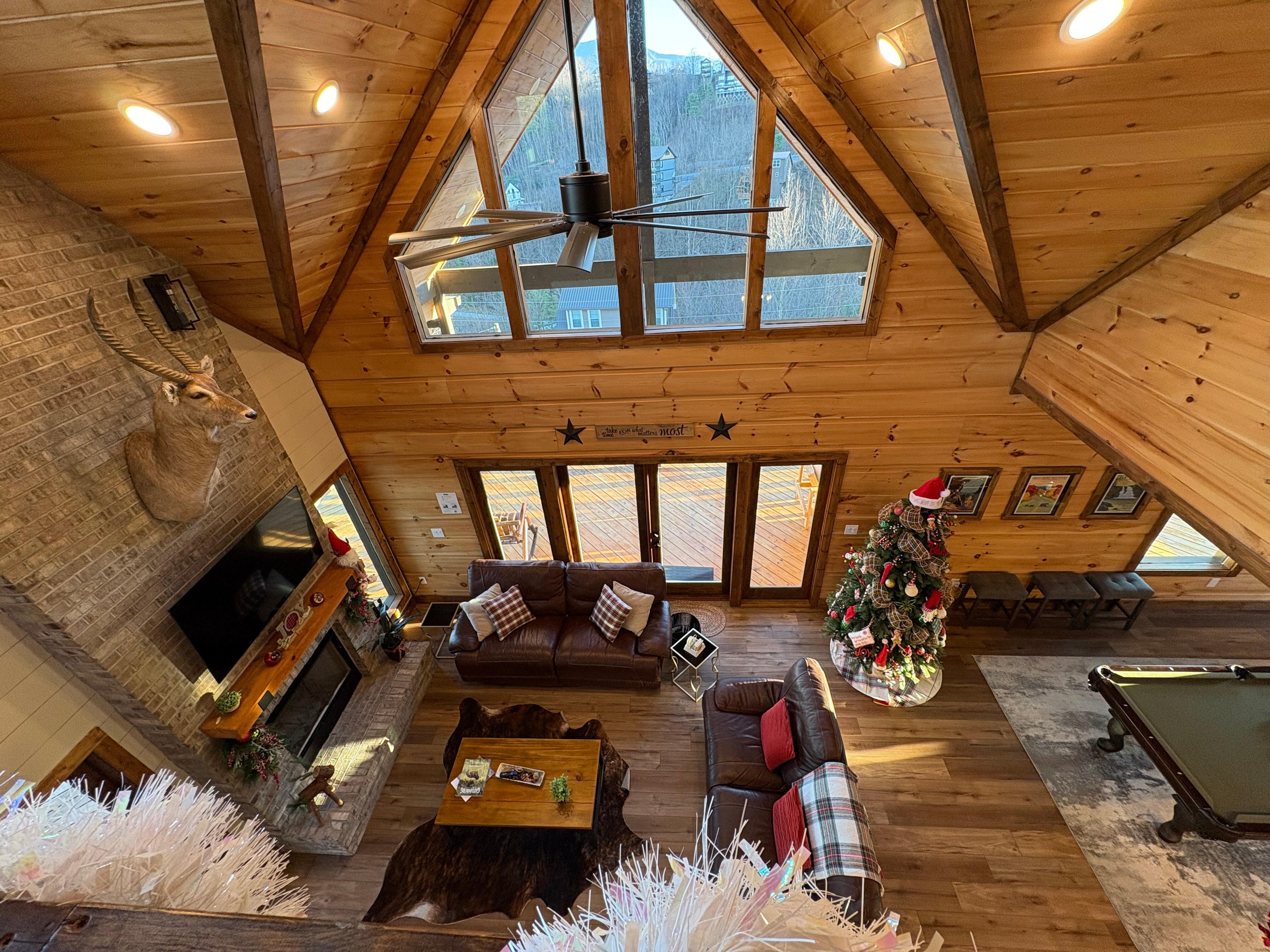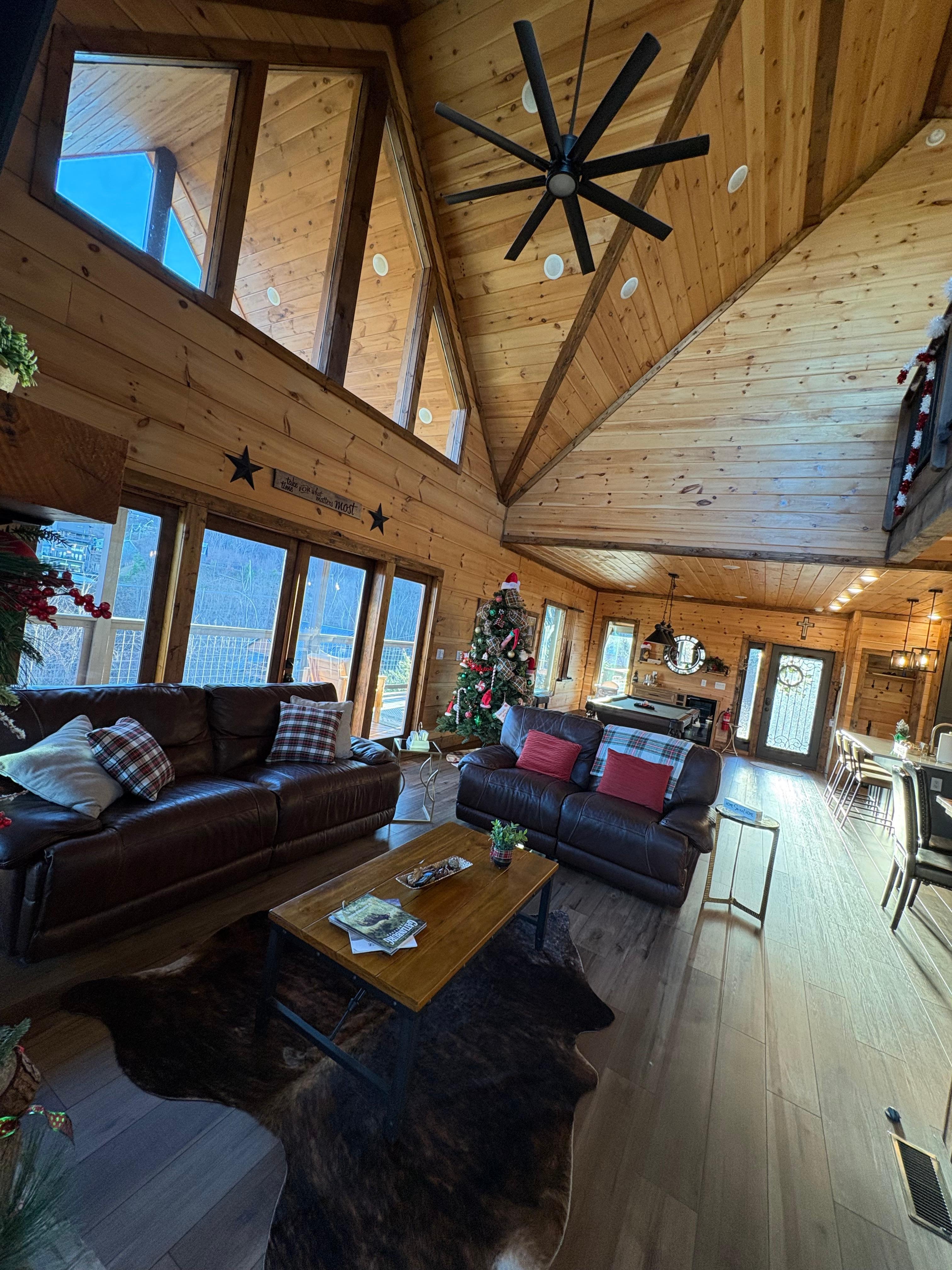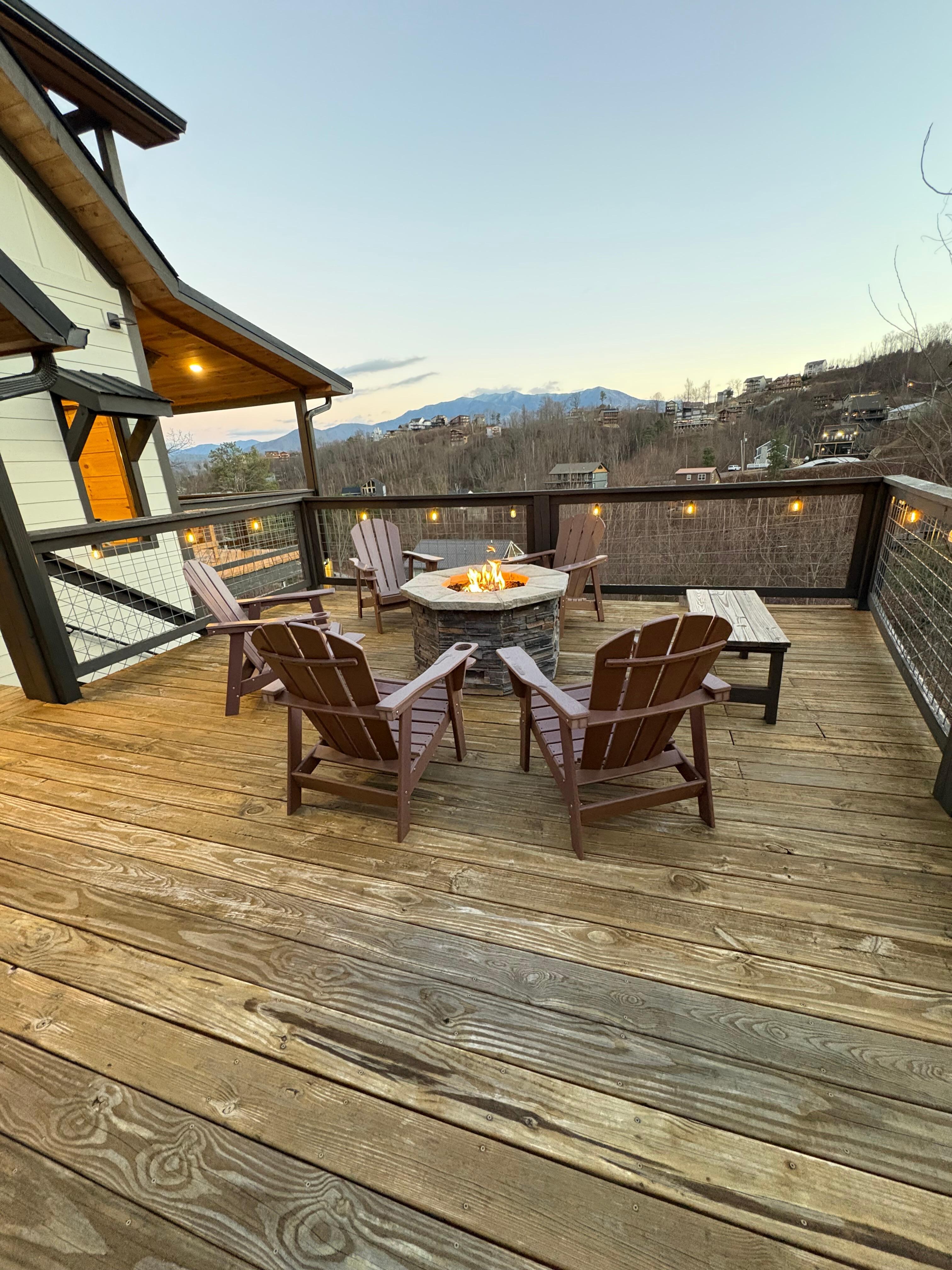 Minutes from downtown Gatlinburg and The Smoky Mountains. New cabin w/ 1 master suite with king bed, 1 junior suite with queen bed, 1 bedroom with 2 bunk beds & sofa bed in loft. Game room includes hockey table, poker table and Karaoke stage! The family room has a real wood burning chimney and pool table. Multiple Decks with mountain views include private hot tub, outside fire pit, patio table and rocking chairs. Amazing views of the Smoky Mountains from every room and very centrally located.