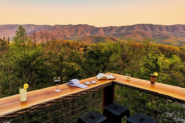 - Highlight of the cabin is the outdoor entertainment area on the deck overlooking The Great Smoky Mountains. String lights set the mood and turn the patio into the perfect spot to relax, have a drink, or enjoy a meal cooked on the charcoal grill.
