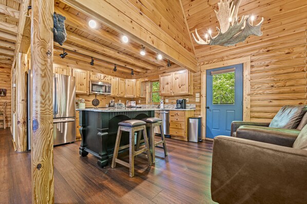 Moose on the Loose is a beautiful, custom built, true log cabin located in the Cobbly Nob neighborhood of Gatlinburg, TN. It has everything you need to enjoy your trip, including a fully equipped kitchen and resort amenities like 3 Community Pools, and Pickleball and Basketball Courts. It is semi-secluded, nestled into the trees with a view of the Great Smoky Mountains National Park right across the street and just minutes to downtown Gatlinburg.