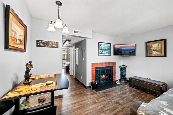 Cozy, fully-furnished condo in the heart of Gatlinburg! Cozy living room with a comfortable sofa, fireplace and Smart TV; There is also a small dining table just off the living room which is also a perfect space to check E-mails or work remotely. The kitchen is fully equipped and comes with everything you need to make your meals inside or enjoy takeout from all the nearby restaurants. Relax outside on the patio or watch your favorite movie while snuggled on the sofa! There is a community Washer and Dryer available for your use in the building and the condo also has free High Speed Wi-Fi!