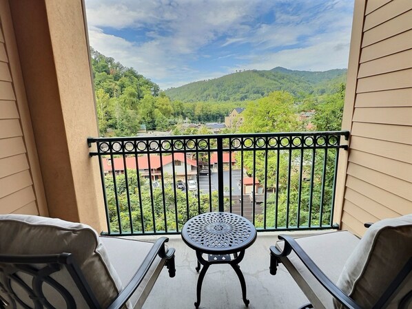 Stunning Mountain views, FREE Parking, 3 smart TVs, 2 balconies, central heat & air, and all new furniture including new mattresses for a restful night's sleep.