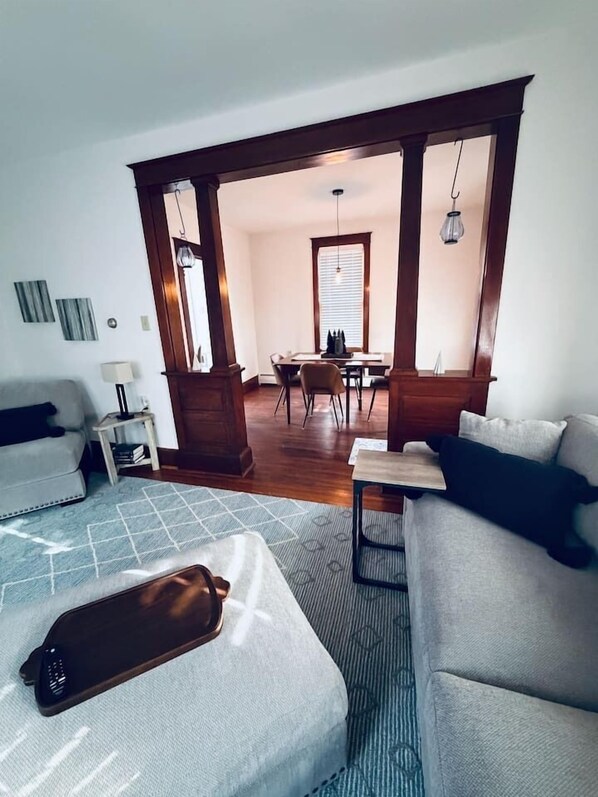The spacious living room features a large sectional sofa—perfect for relaxing, watching TV, or gathering with family and friends. Original woodwork and historic architectural details give the home its authentic charm, while updated furnishings provide a comfortable and welcoming atmosphere.