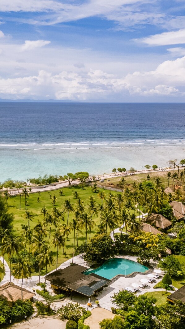 Its located just outside the busy area of Trawangan, making it a quiet resort with nice beach overlooking the green hillside of Lombok and with sunset view. Still only a 5 min walk from the busy part.