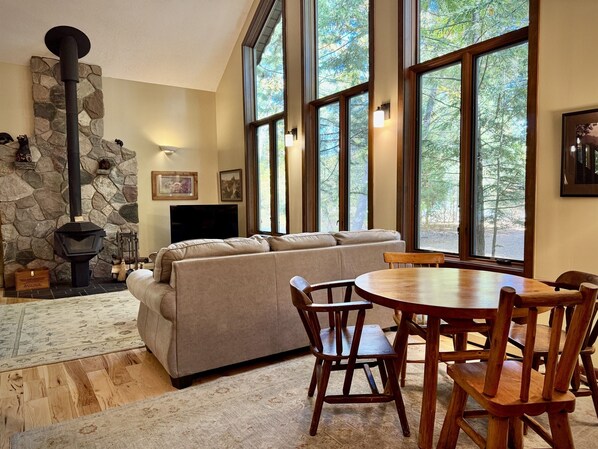 Nestled in the picturesque town of Glen Arbor, Kinnikinnick is just half a block away from the sandy shores of Lake Michigan, inviting you to spend your days soaking up the sun and enjoying water activities. After a day of adventure, return to the comfort of this charming abode, where large windows fill the interior with natural light and offer breathtaking views of the natural wooded setting.