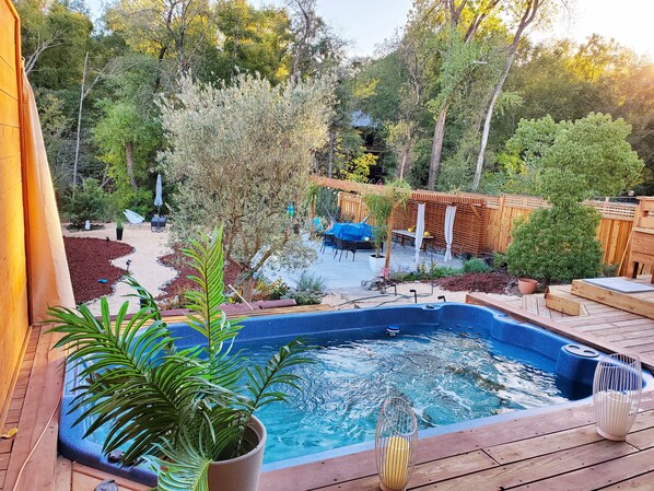 Stuen med moderne innredning og kunst av Marin artist Justyna Wilmore har rikelig med sitteplasser for grupper å spille spill rundt det store bordet, eller nyte show på flatskjerm-TV. En sprudlende og romslig kokkens kjøkken tilbyr: en profesjonell kvalitet Bertazzoni rekkevidde og hastighet ovn, en øy bar med plug-ins for bærbare datamaskiner, og gården stil spisebord som kan sete 12. Franske dører åpne kjøkkenet til dekk og utsikt over den fantastiske hundre år gamle California bay treet og vakre eiketrær. Soverommene hvert åpne for dekk med utsikt over bakgården og bekken. Loftet har store vinduer som gir en frodig trehytte visning. BBQ og spise på to nivå dekk, eller slappe av på de komfortable stoler og sofaer. Dekket har også senket i spa med en mini foss og humør lys. Se på nattehimmelen og lytte til rennende bekk som du suge og nyte en vannstråle massasje. Terrassen i den nedre hagen har et bål, og picnic bord. Under skyggefulle trær en hengekøye er klar til å lulle deg inn i en siesta. Lenestoler sitter ved enden av eiendommen har utsikt over den fredelige rennende bekk, vandrende hjort og eksotiske fugler i den ekspansive tre baldakin.