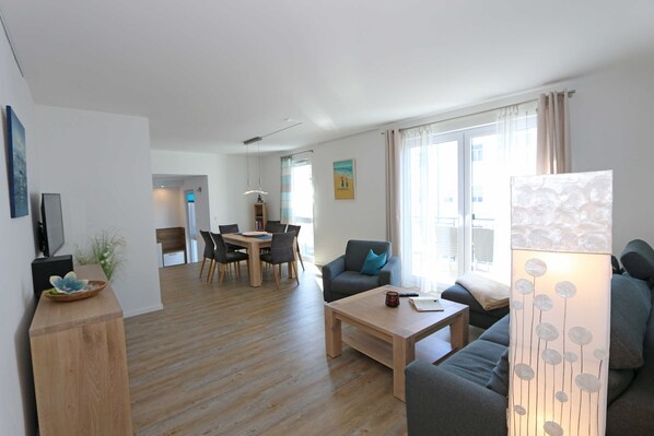 Leiligheten nr. 6 av Villa Anni er et komfortabelt, rundt 82 m² store og stilfullt innredet Røykfrie leiligheter i første etasje. Det gir med sine 3 soverom hjemme sover 5 voksne + 1 barn opp til 3 år i barneseng. Den kombinert stue / kjøkken og spisestue med moderne og integrert kjøkken blader med komfyr, stekeovn, oppvaskmaskin, mikrobølgeovn, kjøleskap, kaffetrakter, vannkoker, brødrister og diverse kjøkkenutstyr ingenting å være ønsket. Spiseområdet passer i kjøkkenkroken. Den åpne stue har en koselig sittegruppe med et salongbord, en stol, en leselampe, en flatskjerm-TV med CD-spiller og en Blu-ray-spiller. Selv på en Internett-tilkobling (WLAN), har du fortsatt nyte ferien. Dette er inkludert for deg! Et utvalg av brettspill og ferie lesing gir en velkommen endring. Den vestvendte, møblert balkong med paraply er direkte tilgjengelig fra oppholdsrommet. Det første soverommet har en dobbeltseng med skum madrasser (1,60 mx 2,00 m), justerbare sengebunner, nattbord skap og en garderobe. Det andre soverommet har en dobbeltseng med en kontinuerlig kaldskummadrass (1,40 mx 2,00 m), nattbord hyller, flatskjerm-TV og en garderobe. Det tredje soverommet har en enkeltseng (0,90m x 2,00m). For en fredelig søvn gir i alle 3 soverom et mørkere. Det første badet har en walk-in dusj, servant, toalett, oppvarmet håndklestativ og hårføner. I det andre badet er plassert ved siden av et toalett og en vask og en vaskemaskin. I soverommene og på kj��kkenet insekt skjermer er tilgjengelig. Alle rommene er utstyrt med en varme og gir en behagelig varme. For våre yngre gjester, 1x barnestol og 1x reiseseng (uten ekstra madrass og uten Bettinlett) inkludert disposisjon. En privat parkeringsplass (. No 6) ligger i underjordisk garasje (inngang høyde: 2,00 m) av huset. Dyr er ikke tillatt i leiligheten! Det første utstyret til en sengetøyspakke (komplett sengetøy, 1 håndkle, 2 små håndklær) kan du bestille opptil 14 dager før ankomst til 15,00 € per person eller tillegg av egen. Fra to bestilte pakker bli lagt en gang en kjøkkenhåndkle og ett bad mat.