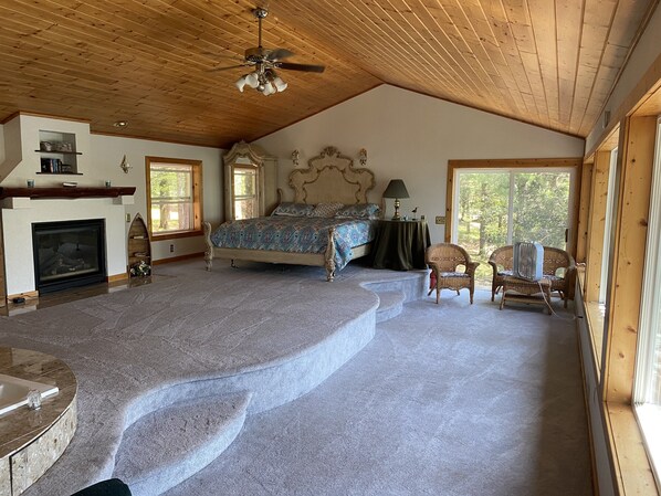 Hovedsoverommet har en king size-seng, stående skap, 3/4 bad, inkludert et nedsunket boblebad med jetporter, vask og toalett. Nyt en uslåelig utsikt fra master suite gjennom en hel vegg av glass som har utsikt over Leader Lake. Hvis du blir litt kjølig om natten, klikk på feltet peis fjernkontrollen for å bli så komfortabel som du vil eller bare nyte stemningen i dette vakre rommet med partneren din. Føl den dype polstrede teppet under føttene når du tar i omgivelsene til denne vakre innsjøen fra master suite. Det er også et loft oppe skilt fra mesteren ved å skyve glassdører med plass til en luftmadrass å sove flere mennesker om nødvendig.