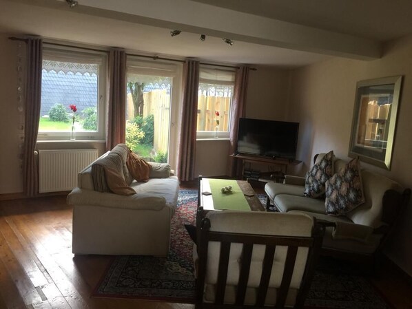 I den nedre halvdelen av huset vårt er det 1 dobbeltrom, (med dobbeltseng), et annet soverom for 3 personer (med 3 enkeltsenger), stue, spisestue, bad, kjøkken og garderobe.