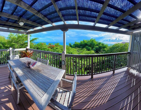 Note – the unit you are renting is called Royal Poinciana and is the top floor King Suite with awesome views of both the Caribbean and Atlantic Ocean from inside the unit and course outside with the 360 degree wrap around deck. Note you have a large portion of the 3rd floor balcony which is blocked off with a privacy door so no other guests can enter your space. There is also a dining table outside in your private section for al-fresco with ocean views! The unit is bright and airy with lots of French doors and windows. The pure white vaulted ceilings are cypress wood tongue and groove style along with gorgeous custom terracotta tile floors. Ceiling fans are located in every room along with very efficient AC units. The King Suite sleeps 4 people very comfortably, adults or kids. There is a very high quality canopy King size bed with high end mattress and top of the line linens for 2 adults in an enclosed private bedroom. The guest bedroom/sleeping area is off the living room and has two twin beds and in its own separate room, although it is a smaller room - see photos. ***Note the guest bedroom is locked unless the reservation is for three or more people. If you have any questions or wish to have the second room open just ask us. The overall décor is lovely, tropical and filled with bright and colorful Caribbean theme. The big and beautiful kitchen has everything you need from cooking full meals and sit down dining for 4 people. It has all the goodies you need like coffee maker, toaster, blender, cookware, wine glasses, etc. There are USB phone chargers and a hairdryer provided also. Of course you have the basics such as; seasonings, soap and shampoo, linens, towels, beach and bath towels, kitchen towels, toilet paper, paper towels, trash bags, kitchen sponge and dish soap, iron and ironing board, etc. There is a small library of books for your reading pleasure. Beach chairs and beach umbrella is also provided. It is the nicest and by far the biggest unit at almost 600 sq ft of living space not counting exterior decking. You can see the photos section for a better visualization of the interior and exterior of your unit. Note you have an entire section of the 3rd floor balcony which is all blocked off with a privacy door so no other guests can enter your space. There is also a full size dining table outside for al-fresco eating with ocean views!
