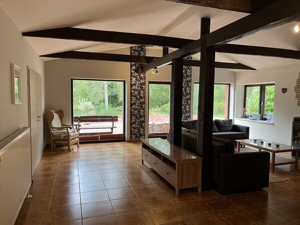 Uteområdet, som består av en stor, delvis overbygget terrasse med grillutstyr, kan nås direkte fra kjøkkenet eller fellesrommet, og tilbyr en klar utsikt over naturen på dagtid og utsikt over stjernene om natten. Husets idylliske beliggenhet byr på god plass for barn.