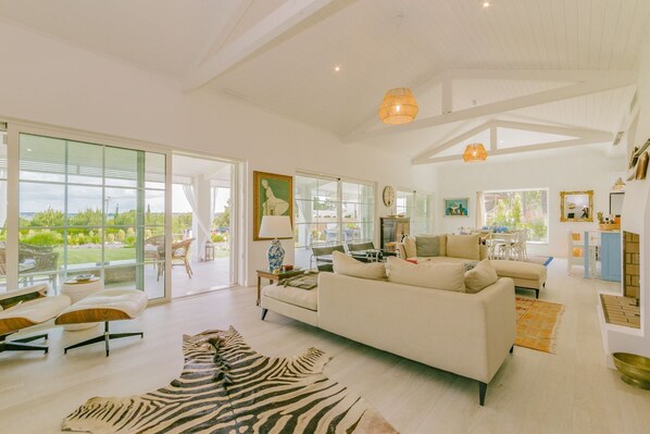 - Ample living room with comfortable seating area, fireplace and access to a terrace