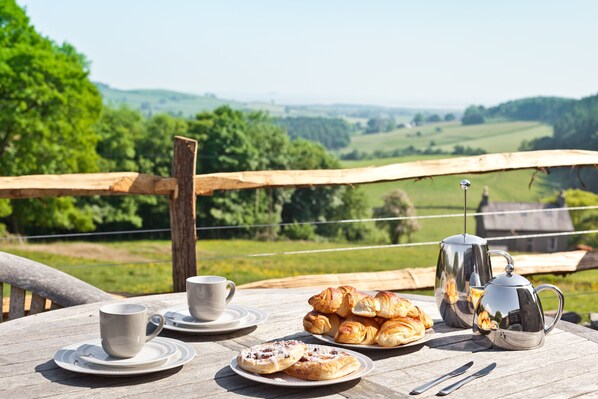 Hagen har en BBQ, et stort bord og stoler og er et veldig fredelig og avslappende område å sitte og slappe av eller spise ute.