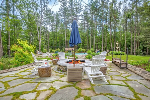 In one of the most sought after destinations in the Berkshires, located just outside Great Barrington near the top of Baldwin Hill where the mountains ring your view in every direction, sits a secluded three bedroom home with heated pool, hot tub, sauna, wood firepit, pickleball court, separate Clubhouse, and extensive gardens. Home has a master bedroom suite located on the first floor with a California King bed, enhanced by an expansive two-room bath with walk-in shower and beautiful soaking tub surrounded by marble-- and your hot tub and sauna are right outside via your private door. This room is equipped with its own Asko washer and dryer. Upstairs, find two bedrooms (one with a King bed and one with two Twins) and a large living room full of windows overlooking the forest. Living room has extra large flat screen TV and a gas fireplace, along with full bar area with beverage cooler, dishwasher and icemaker. Daybed with with real twin-sized mattress for overnight guest is super comfy when cuddling in for movie night! Fully modern kitchen with gas range and Perlick fridge, freezer drawers and icemaker stretches seamlessly into the family area where you will find a wood burning fireplace surrounded by windows with views of the professionally maintained lawns, gardens, and pool. Extra large round dining table seats 10+ people in comfortable upholstered chairs! All bedrooms have remote controlled exterior privacy shades on all windows. In a separate building, the Clubhouse is designed for gathering with its loft office/teen/gaming area stocked with Switch that's loaded with games, Queen sleep sofa, full bathroom, gas wood stove-style fireplace, kitchenette, and beautiful deck with outdoor gas fireplace for warmth on those chilly evenings, overlooking the woods. House and Clubhouse are modern and filled with light. Bonus Pink House with porch swing is heated and has a full fridge and a large sink -- it's the perfect spot from which to serve drinks and al fresco meals to your guests! Propane bbq for grilling near the lounge area by the pool, and on the other side of the pool is a screened in porch for dining bug free or relaxing in the shade. After a pickleball match, you'll want to take a swim in the heated pool, or head straight to the hot tub or sauna! Or just enjoy a hot shower in the private outdoor shower area. Take a long walk to the back of the 18 acre property via wide full driveway, or do as the locals do and walk to the top of Baldwin Hill. A huge expanse of the rear yard is fully fenced for your pet. In addition, there is a small pet run accessed through the one car garage, where you will also find a pet washing station and the second washer and dryer. We have both Tesla and generic car chargers installed for your convenience. Located in the quiet hamlet of Egremont, MA just minutes from everything the Berkshires has to offer! Catamount Mountain Resort 5 minutes; Lenox, MA and Tanglewood 30 minutes; Stockbridge, MA 25 minutes; Hudson, NY 30 minutes; Chatham, NY 25 minutes; Butternut Ski Resort 20 minutes, Monument Mountain 20 minutes. We provide everything you need for your stay including high quality organic linens (our mattresses are all organic too), fully stocked kitchen (including fresh spices, oils and vinegars), toiletries, pool towels, and firewood. Lightning -fast fiber optic internet with separate modems for house and Clubhouse ensures you are never offline. Whole house generator covers both buildings, so you won't be affected if the local power fails! Parking for 8+ vehicles. We pride ourselves on the cleanliness of our home. Allergy sufferers will appreciate the bare teak floors and lack of curtains, along with regular steam cleaning of upholstery. Our cleaning team uses only non-toxic and natural cleansers and our linens are free from softeners or fragrances. Air ducts, windows and exterior are cleaned twice per year, and we are happy to come by to correct any variance from a sparkling clean and comfortable home for your stay! With our local management team, we are always around the corner to assist you with whatever needs may arise. We also offer additional services such as full cleaning, daily freshening, grocery delivery, or whatever else you may need. Pamper yourself on your next visit to the Berkshires!